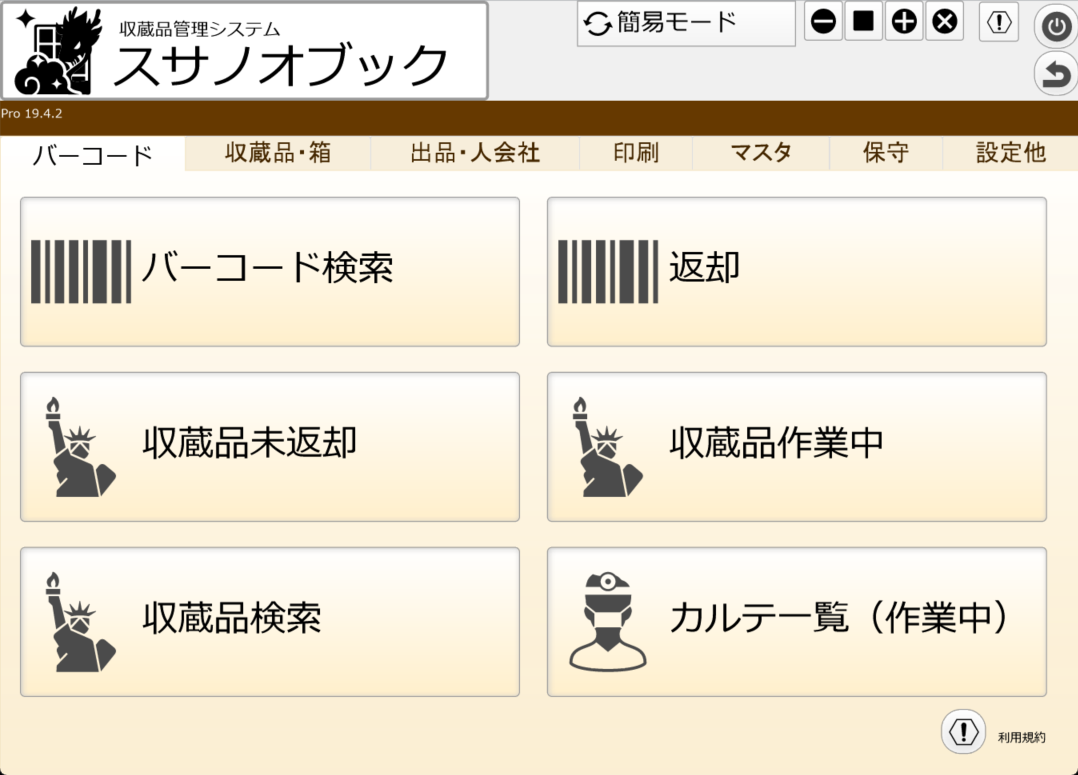一品ごとの貸出や職員が作業するときに使用登録を行う。登録はバーコードを使って行う。 |