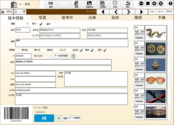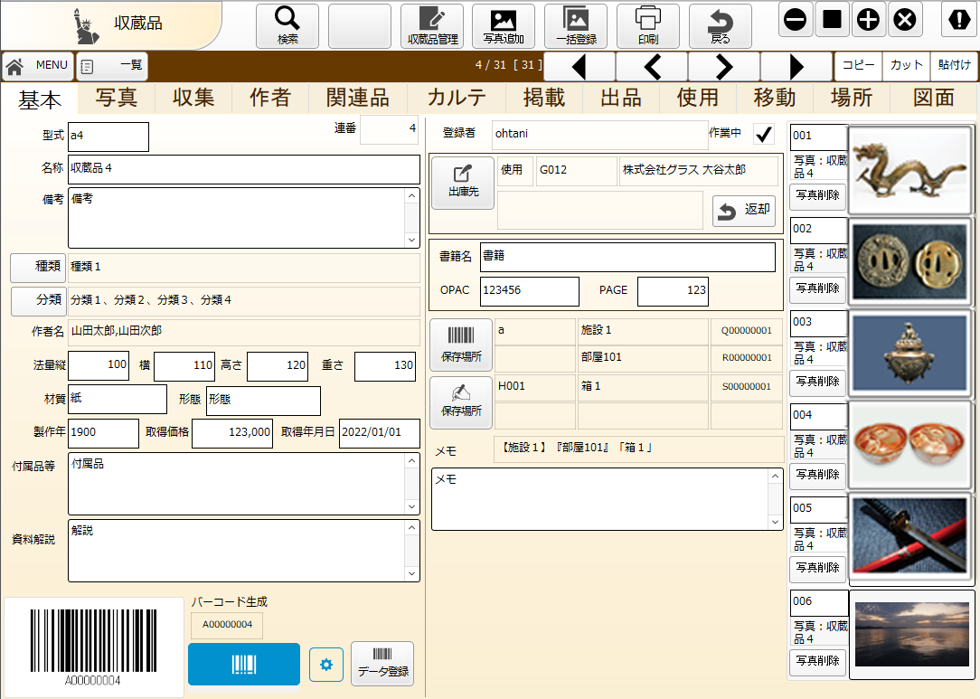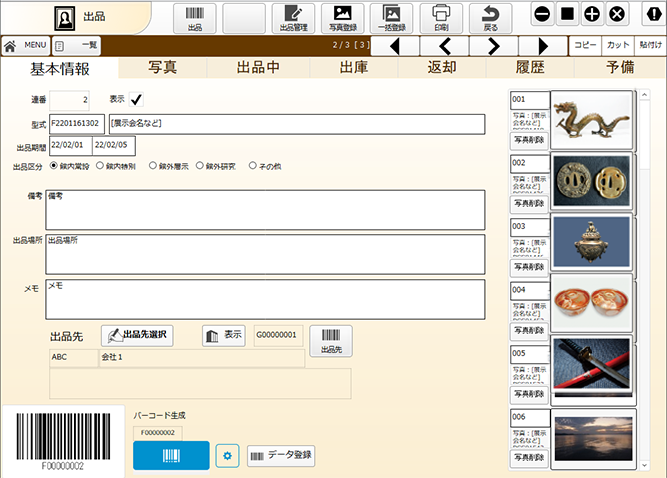 収蔵物の名称・種類・作者・法量・製作年、取得情報、寄贈者、購入先、解説、保続品などの収蔵物情報を管理する。 |