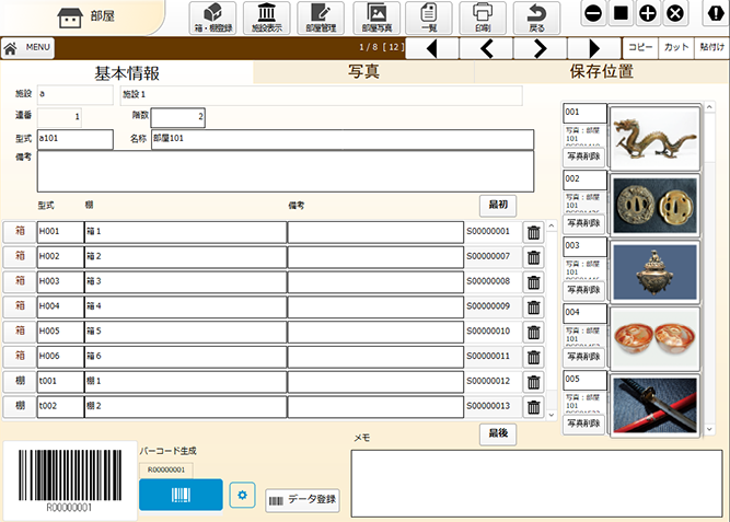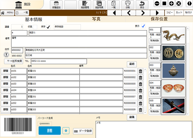 収蔵品を収集した場所を管理する。 場所は施設・部屋・棚(箱)・段で登録する。 発掘品などは施設・部屋・棚・段を地域・住所・区間・位置などに置き換えて管理する。 施設・部屋・棚・段に保存してある収蔵品リストを作成する。 |