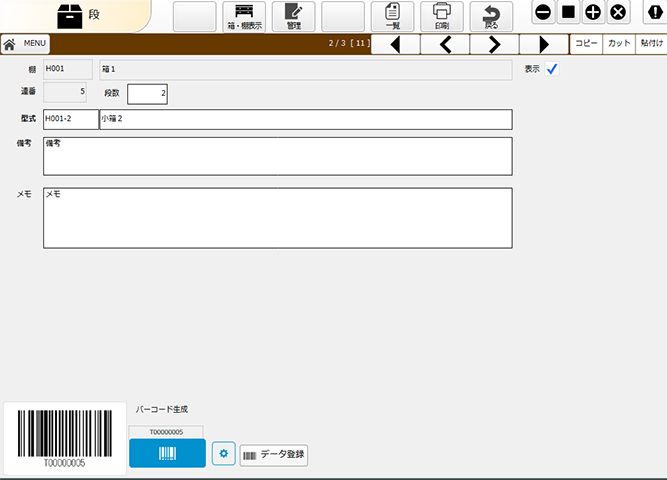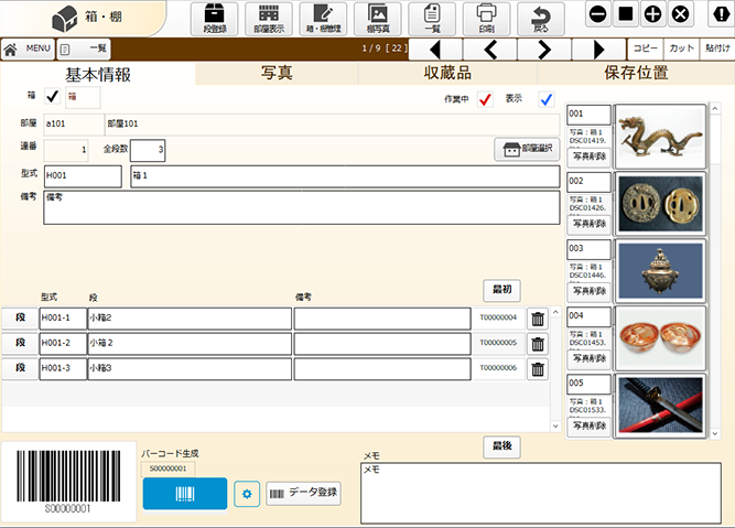 収蔵品を保存している場所または箱を管理する。 場所は施設・部屋・棚・段で登録する。 箱に収蔵品を入れ、施設・部屋・棚・段に保存する。 収蔵品は施設・部屋・棚(箱)・段に保存する。 施設・部屋・棚(箱)・段に保存してある収蔵品リストを作成する。 |