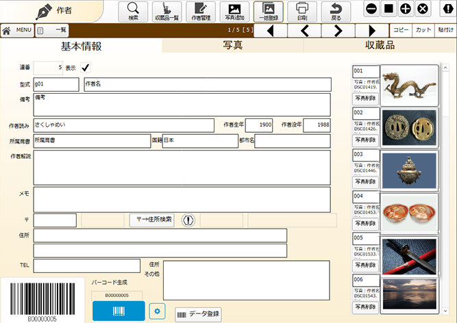 収蔵品の写真・データを登録する。iPadの場合、iPadのカメラ機能で撮影・登録することができる。 撮影数に制限無し。サムネイルは5列×6枚表示。5列目はスクロール表示。 |